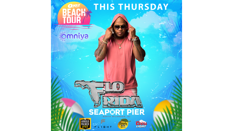 Flight Entertainment and the Seaport Pier proudly present the Q102 Summer Beach Concert sponsored by Coors Light, Arnold Palmer Spiked Half & Half and Simply Spiked Lemonade. The event takes place on Thursday, August 10th with pre-game drinks and dining at 5 pm and concert doors opening at 7 pm. Global Superstar Flo Rida SEE HERE, whose resume includes eleven top ten and three number one hits, graces the biggest outdoor stage in South Jersey for a very special concert. The undisputed Party King of the Late 2000s electrifies the crowd with his “feel good” rap, pop, and electronic dance hits such as Low, Wild Ones, Good Feeling, Whistle, and My House just to name a few.
