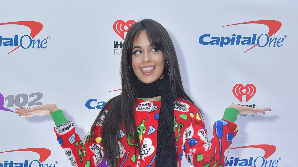 Camila Cabello stuns in Elf Onesie on our Q102 Jingle Ball Red Carpet presented by Capital One. Photo by Getty Images