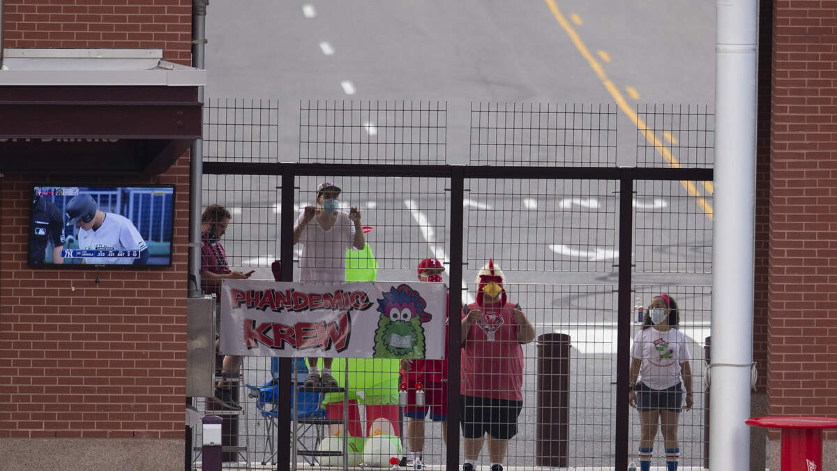 PHILADELPHIA, PA - AUGUST 06: Fans watch the game between the New York Yankees and Philadelphia Phillies from outside of Citizens Bank Park on August 6, 2020 in Philadelphia, Pennsylvania. The Phillies defeated the Yankees 5-4. (Photo by Mitchell Leff/Getty Images)